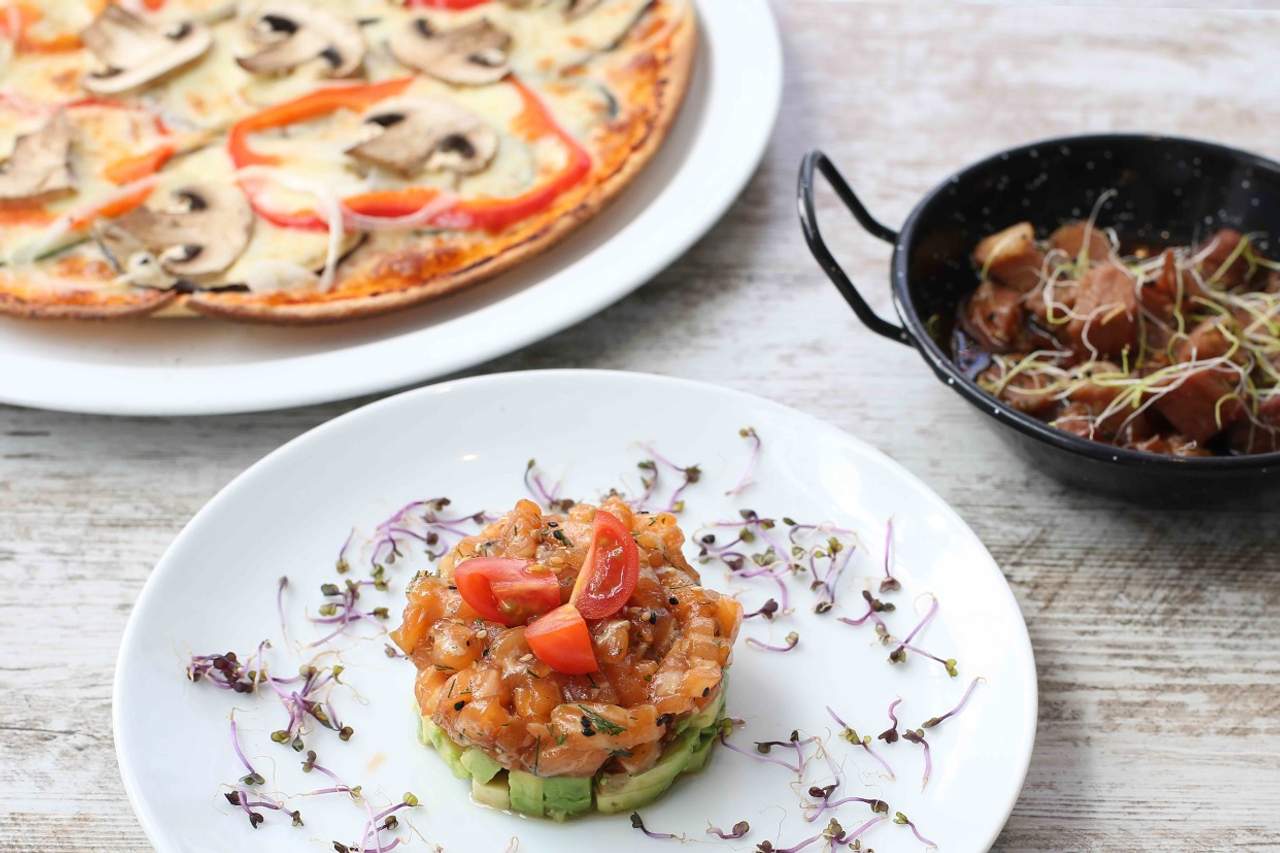 Con salmón ahumado, cebolla, queso crema, rúcula