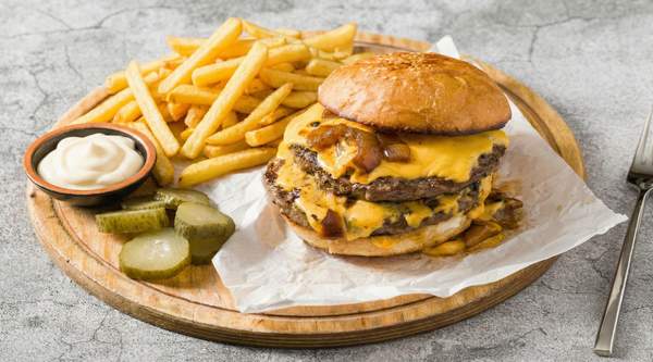 Smash patty, queso, mucha cebolla a la plancha, pepinillos, salsa Comeback