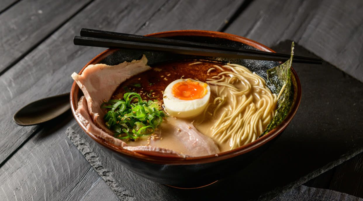Fideo ramen, huevo marinado, chashu, espinaca y caldo sabor a soja