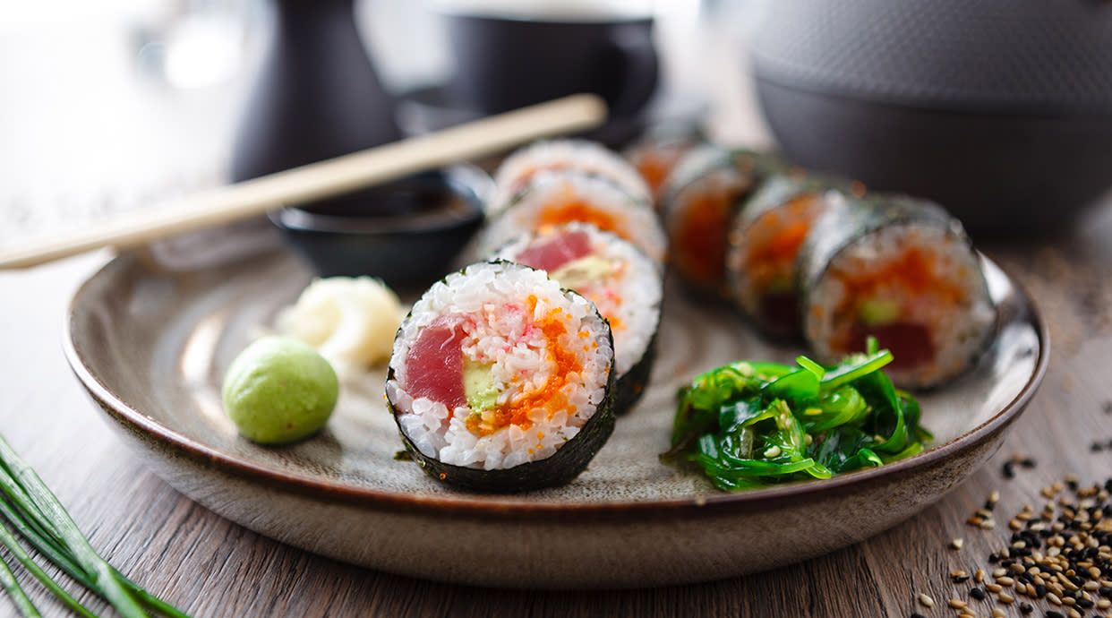 Arroz sushi , alga nori, tobiko. (Gluten/pescado/soja)