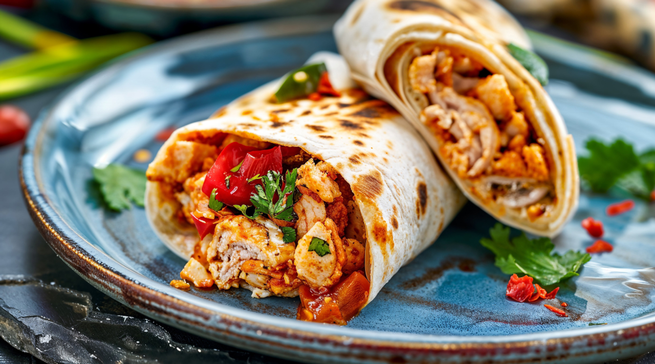 Tortilla de trigo rellena con queso, pollo, pulled pork, pimiento rojo, pimiento verde, arroz y frijoles