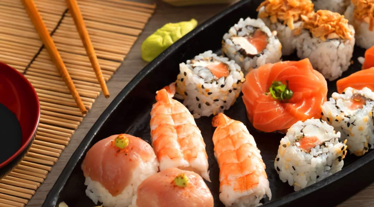 Nigiri de salmón (2 uds.), nigiri de atún (2 uds.), rollo California (4 uds.) y rollo de salmón con queso (4 uds.)