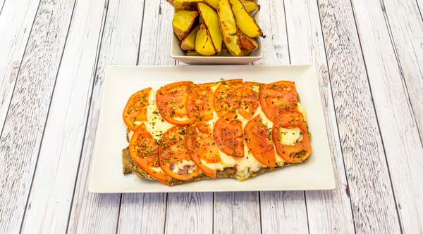 Milanesa de ternera con salsa de tomate, mozzarella y jamón york. Acompañada de patatas y ensalada (tomate y lechuga)