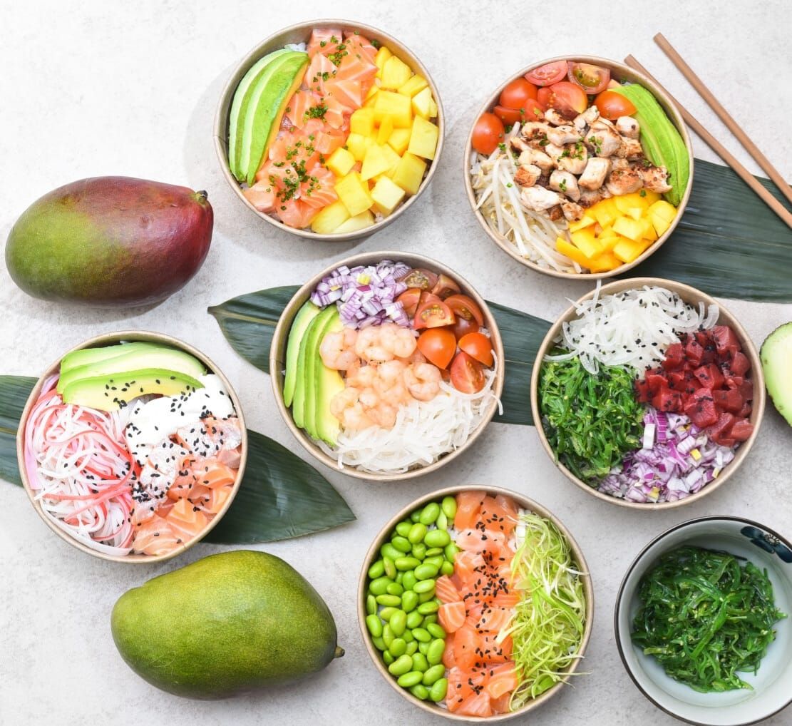 Base de arroz, gambones rebozados, fruta del día, tomate cherry, edamame, aguacate, sésamo, salsa acevichada.
