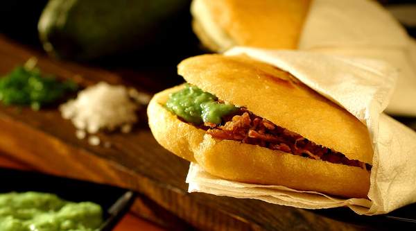 Carne mechada, pollo, trocitos de chicharrón de cerdo, queso rallado, aguacate, lechuga, tomate y cebolla en rodajas