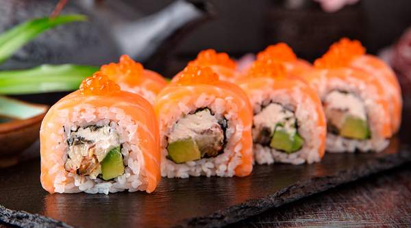 2 sushis de salmón + 2 sushis de atún + 1 sushi de gambas + 1 sushi de pez mantequilla + 4 makis de salmón + 4 makis de atún
