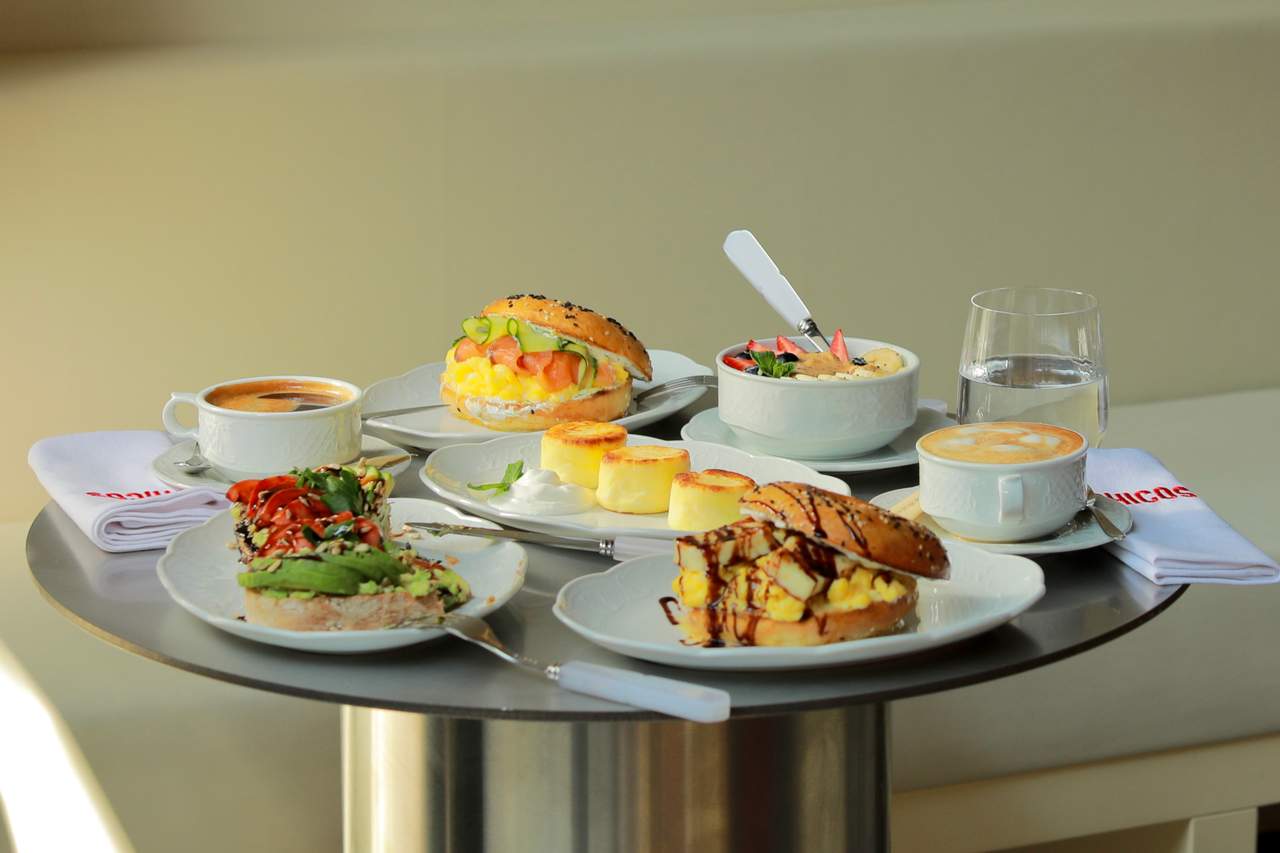 ტკბილი ბრიოშის პური, ავოკადოს პიურე, დამარილებული ორაგული, პორშირებული კვერცხი, ლიმონის წვენი, ოლანდეზი