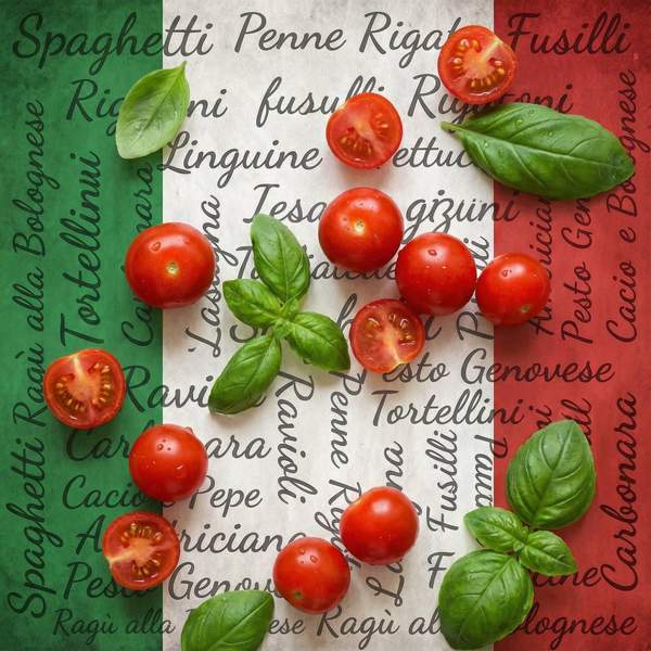 პასტა ტალიატელე, ნიორი, ხახვი, პარმეზანი, პომიდორი ჩერი, ოხრახუში, ტომატის სოუსი, ზეთი, შავი პილპილი, მარილი.