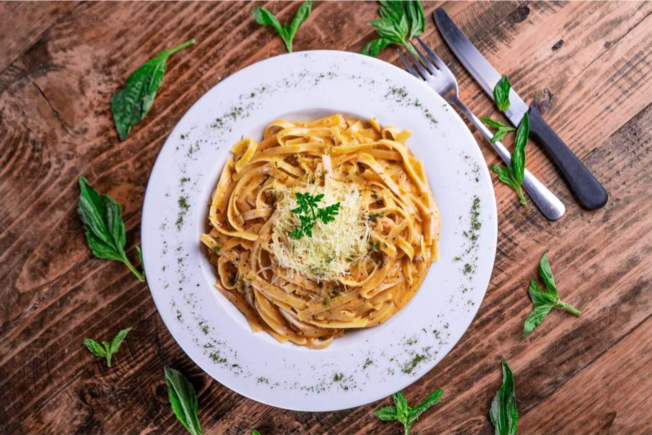 პასტაჩის სპეციალური პესტოს სოუსით, მზეზე გამომშრალი პომიდორი, ნაღებით ხელნაკეთი იტალიური გურმანი პასტა მომზადებული პარმეზანის ბორბალში. (ფეტუჩინი) ცომი შეიცავს კვერცხს. (პესტოს სოუსის შემადგნელობა: არაქისი, ბაზილიკი, თხილი, ნიორი