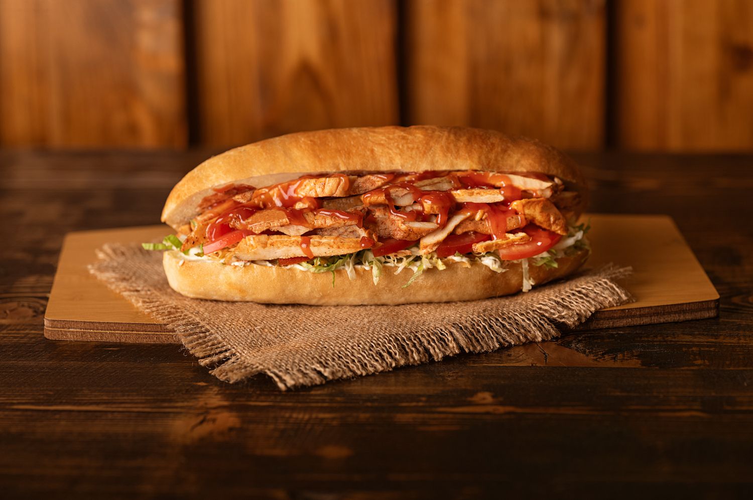 პური, სალათის ფოთოლი, პეკინური კომბოსტო, ცხარე წიწაკა, ხახვი, პომიდორი, ქათმის ხორცი, საფირმო სოუსი, კეჩუპი