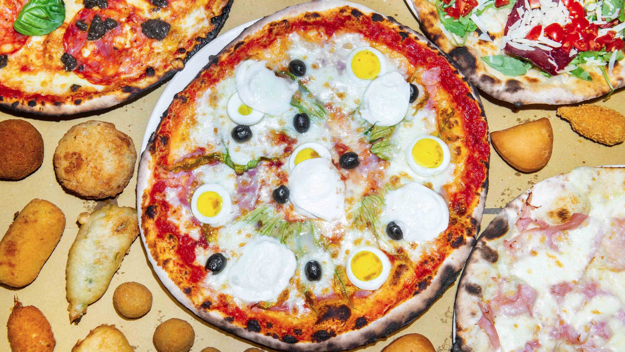 Pomodoro, mozzarella, prosciutto cotto, fiori di zucca, uovo e olive nere
