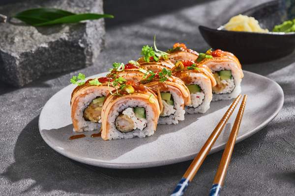 Salmone,avocado,cipolla fritta,teriyaki,lime