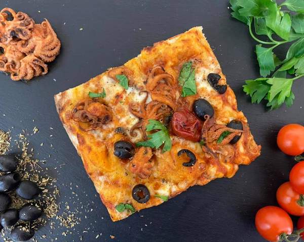 Mozzarella, salsa, tartufata, funghi, freschi, salsiccia e bacon, croccante