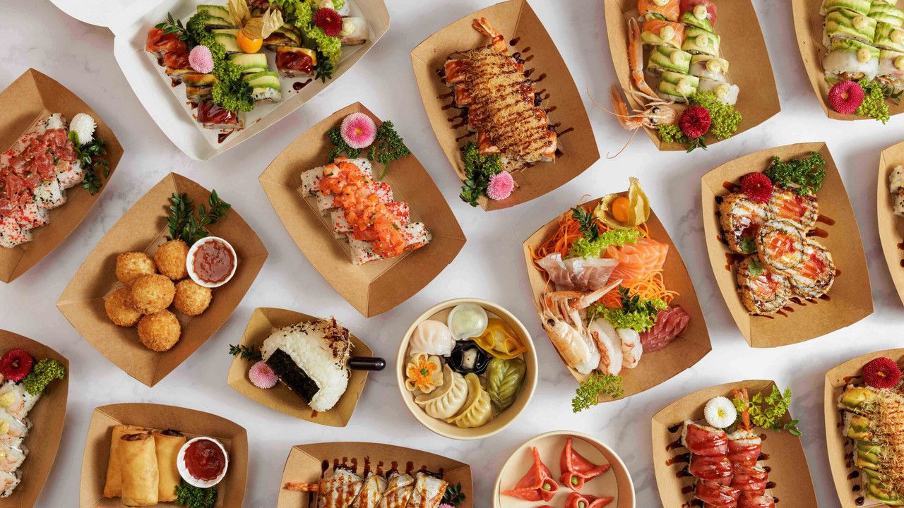 Gambero fritto, maionese, salmone alla fiamma esterno, teriyaki, kataifi, sesamo