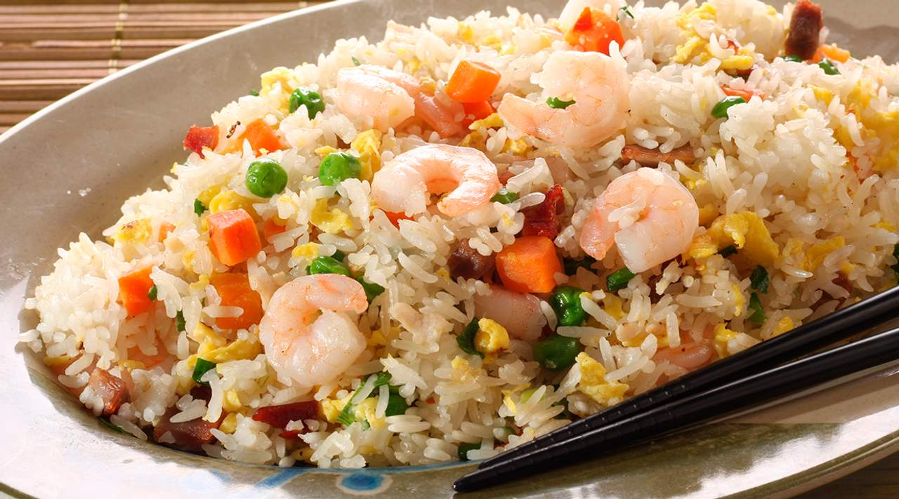 Spaghetti di riso, gamberi, verdura mista e surimi