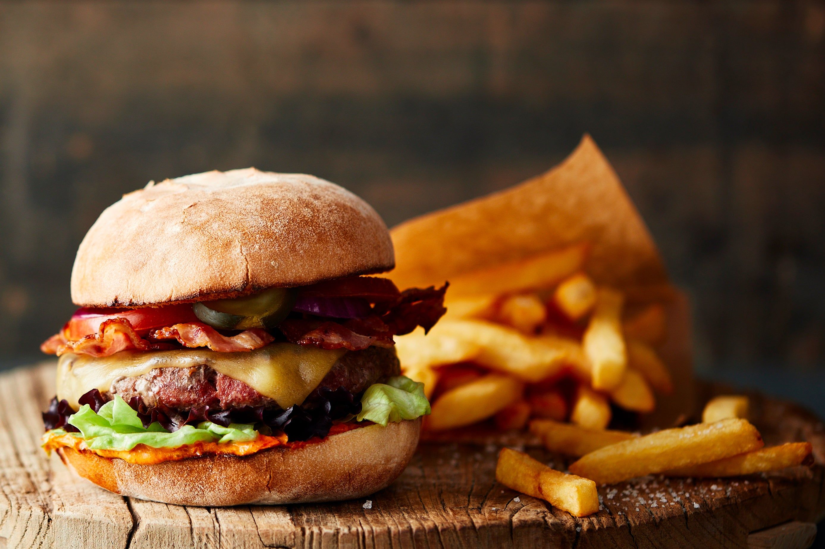 Burghero di manzo, anelli di cipolla pastellati e fritti, pancetta croccante, miele affumicato al pepe nero, scamorza vaccina, spinaci al vapore, maionese