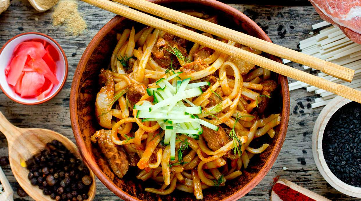 19.NOODLES CON POLLO, MANZO, GAMBERI, VERDURA E UOVO