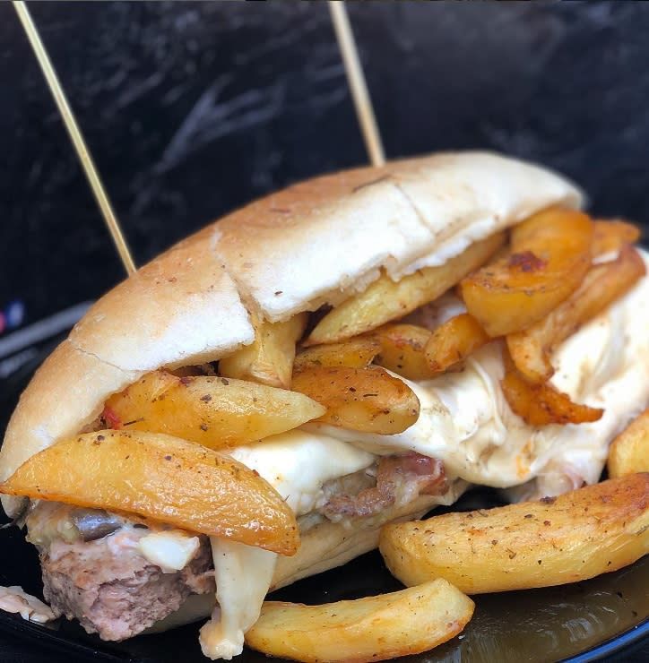 Cheesesteak (carne macinata con formaggio), bacon, scamorza e patate,
