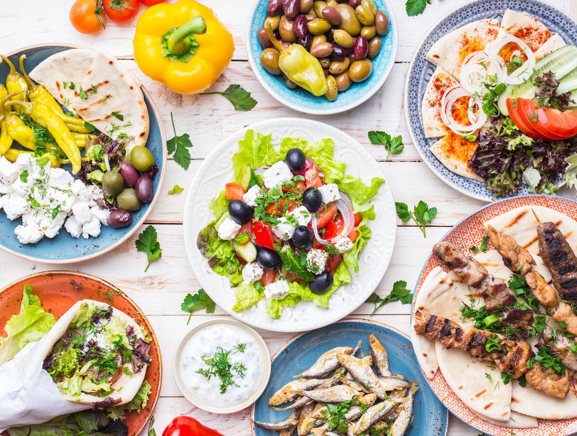 Insalata con feta, peperoni, pomodoro, cipolla, cetrioli, olive e carne a scelta (souvlaki maiale/pollo, giros, bifteki)