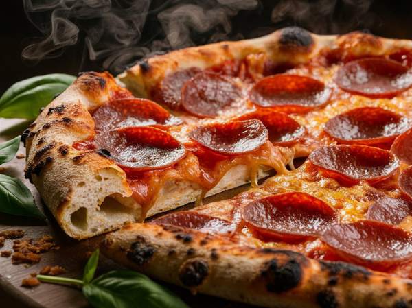 Salsa di pomodoro, mozzarella fior di latte, salame piccante, cipolla rossa, olio EVO