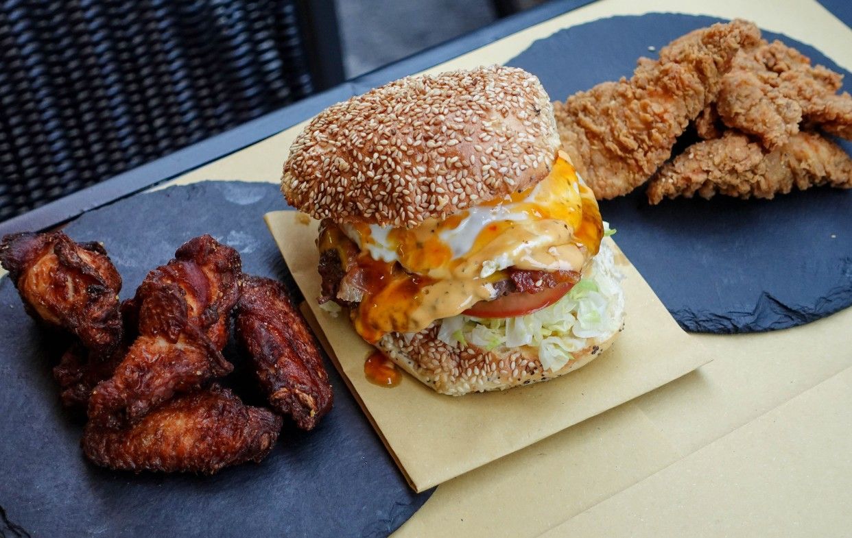 Burger 150 g, insalata, pomodoro, cheddar, cipolla caramellata, bacon, salsa Encona Carolina Reaper