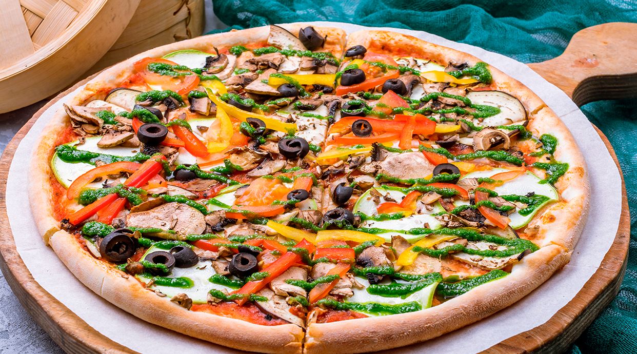Salsa di pomodoro, fior di latte, polpo, calamaro saltato, gamberone, cozze, vongole (secondo disponibilità, la varietà di pesci potrebbe variare)