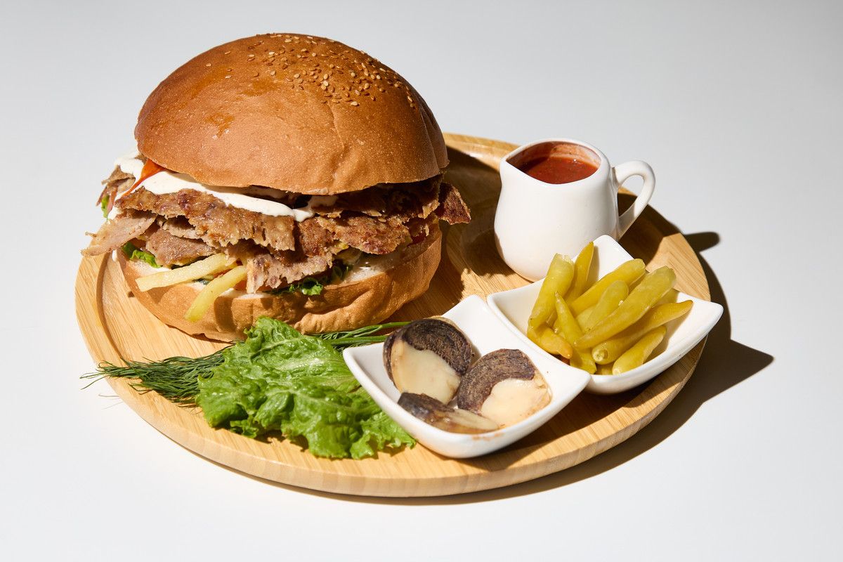 Булка,мясо говядина, помидор, огурец, картошка фри, чесночный соус, кетчуп, майонез, сыр