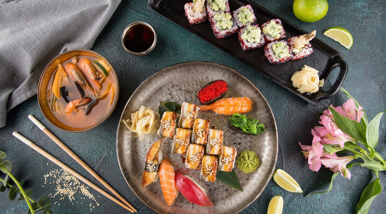 Суши с сочным угрем, поданным с глазурью терияки, создающей сладковатый вкус.