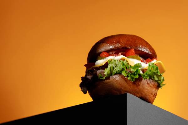 котлета на основе нута, чечевицы, фасоли, шампиньонов, овсянки, свеклы. Сыр чеддер, булочка бриошь, карамелизированный лук, маринованные огурцы, айсберг, помидоры, горчица