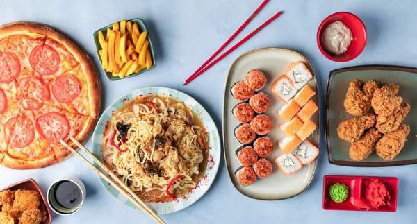- Пицца "Пепперони" - Пицца "Маргарита" - Ролл "Филадельфия гриль" - Ролл "Крабс" - Ролл "Нежный" - Компот из сухофруктов (1 л.)