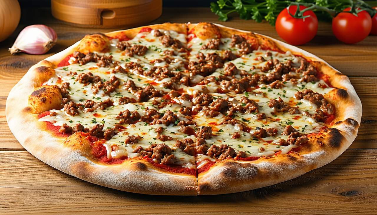 Sauce tomate, mozzarella, viande hachée épicée, oignons, poivrons