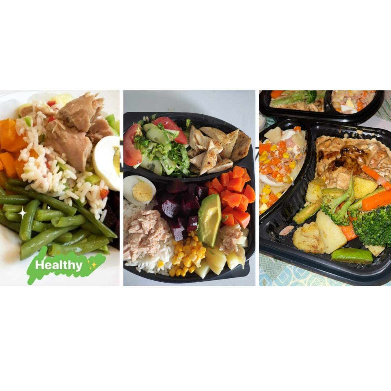 Poulet, Avocat, Riz, carottes, pomme de terre, betterave, Haricots, tomates, concombre,laitue,thon, maïs,oeuf,
