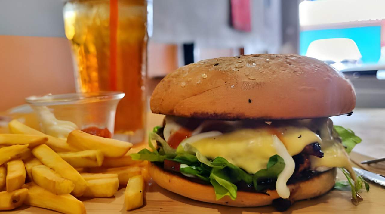 Pain, viande hachée, cheddar, frites