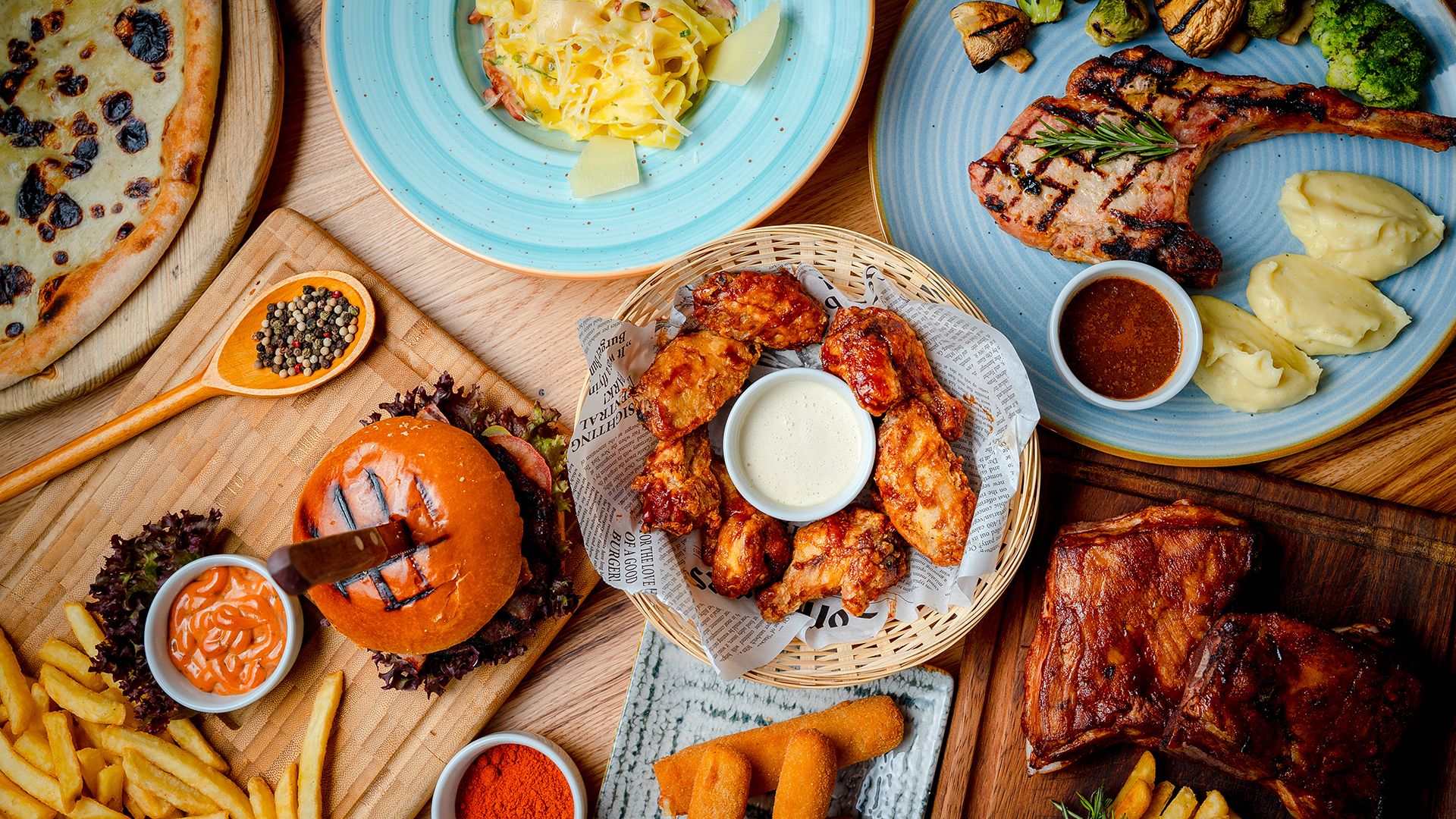 Из говяжьей вырезки, свиной грудинки, куриной грудки тандури, маринованных куриных окорочков, домашних колбасок, бараньей котлеты с розмарином и ассорти маринованных овощей.