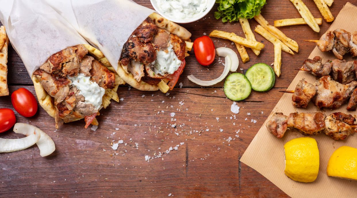 Mięso, ser, surówka, pita, sosy. Rodzaj mięsa i dwa sosy do wyboru.