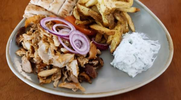 sałata lodowa, pomidor, ogórek, cebula, ser feta, oliwki zielone, kurczak, sos