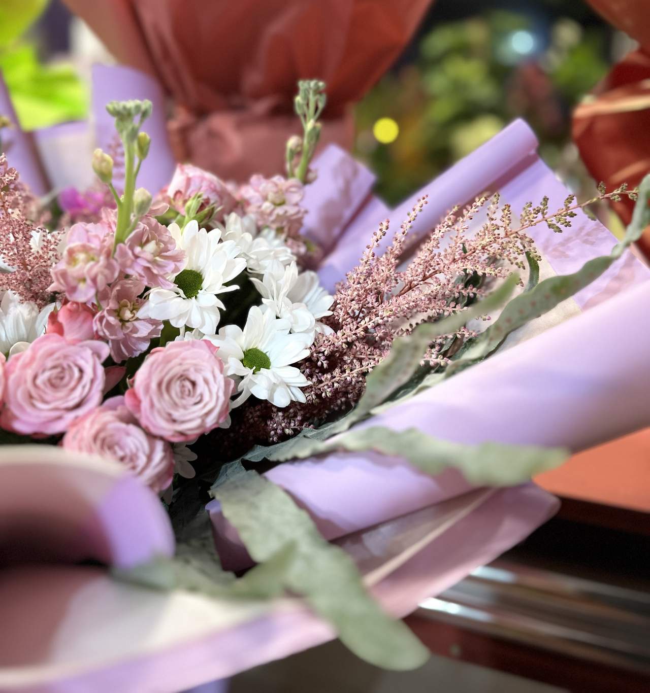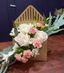 Elegancka, zimowa kompozycja kwiatowa, umieszczona w dekoracyjnym, okrągłym koszyku wykonanym z białych, splecionych gałązek.