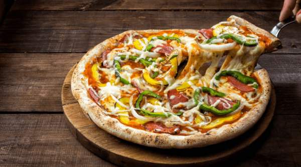 z szynką, kurczakiem, bekonem, pieczarkami, cebulą i papryką
