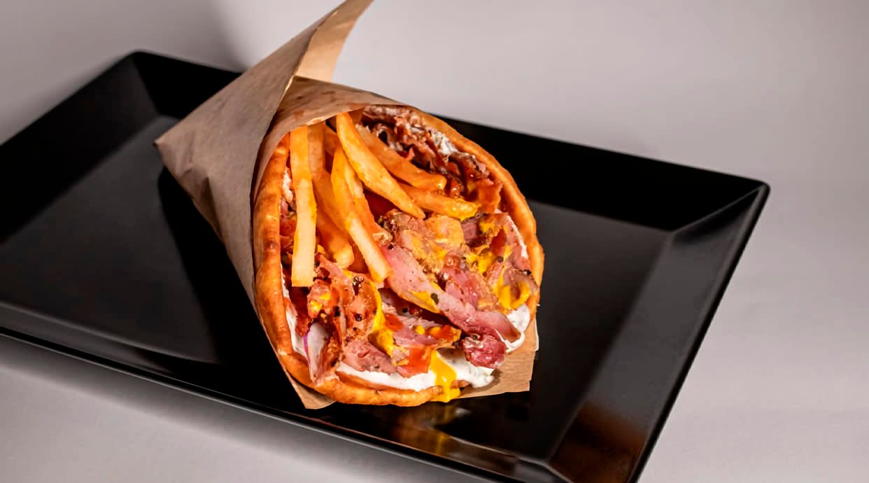 z wołowiną i frytkami pod roztopioną warstwą sera, sałatką i sosem do wyboru
