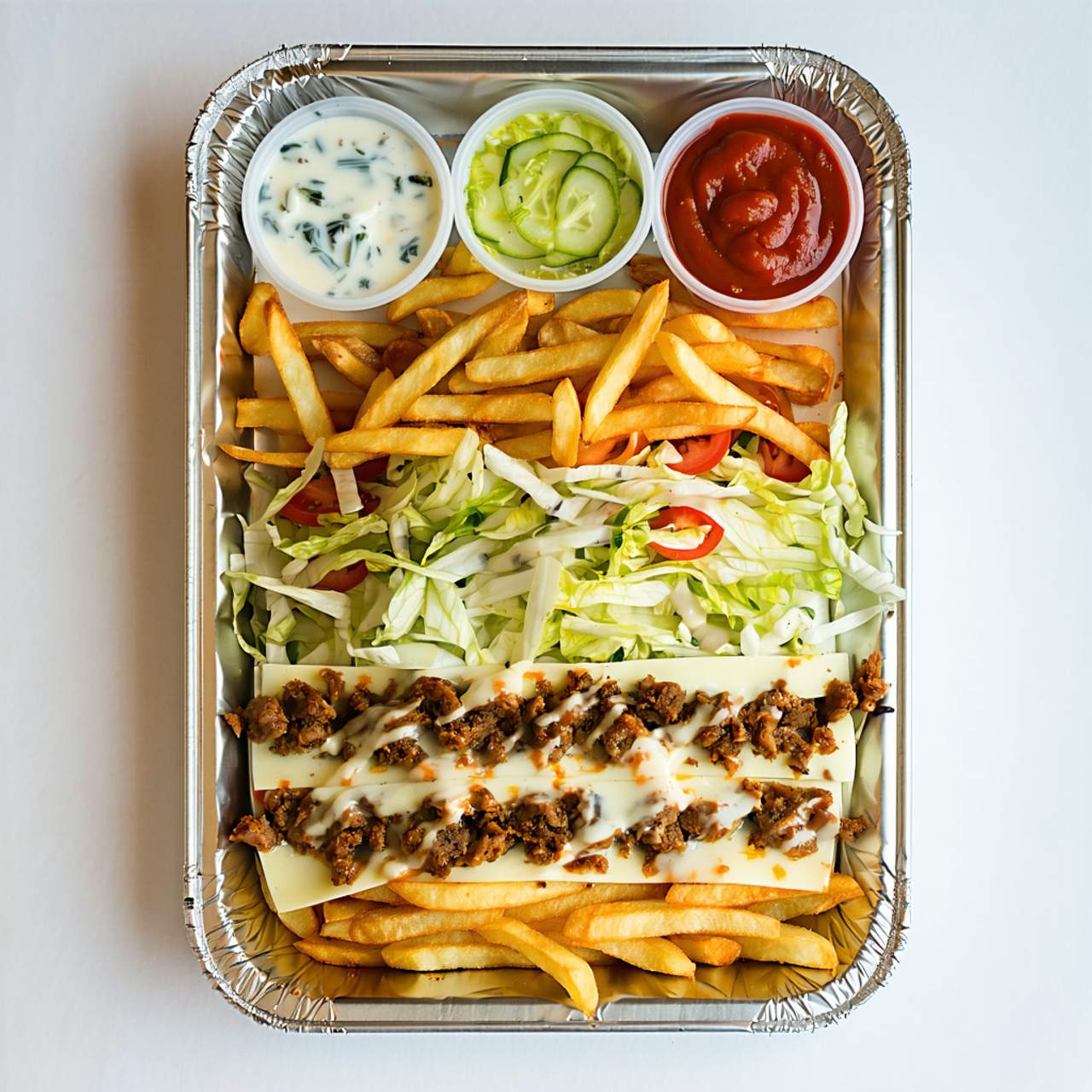 Mięso wieprzowe, frytki, ser, świeże warzywa, sosy