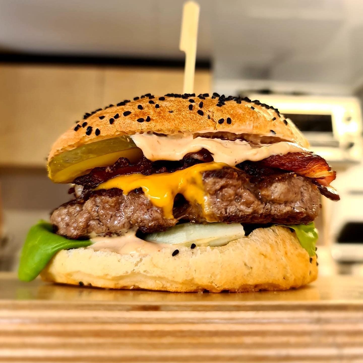 Buła / Wołowina / Cheddar / Ser góralski / Ogórek / Krążki cebulowe / Sos autorski / Żurawina