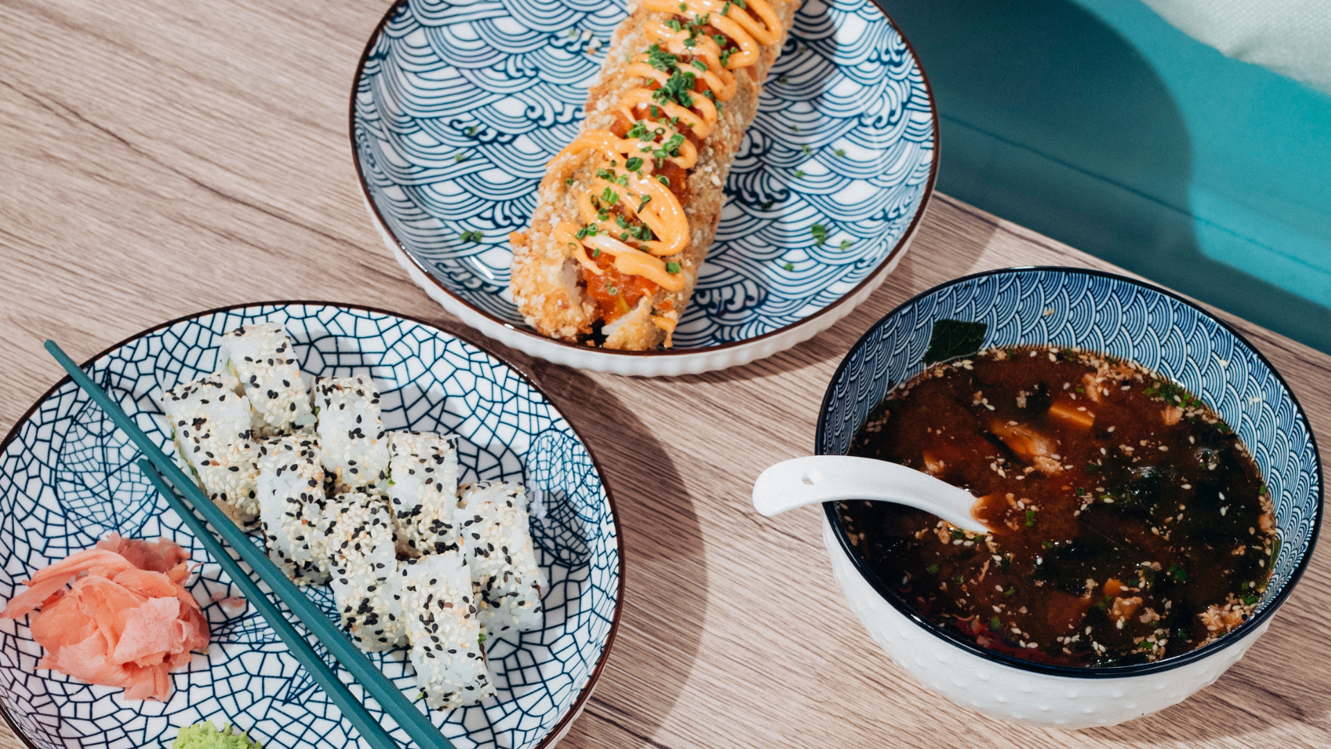 ryż, nori, łosos, ser cremowy, krabowa mieszanka, panko, tobiko, sos unagi, sezam, tempura