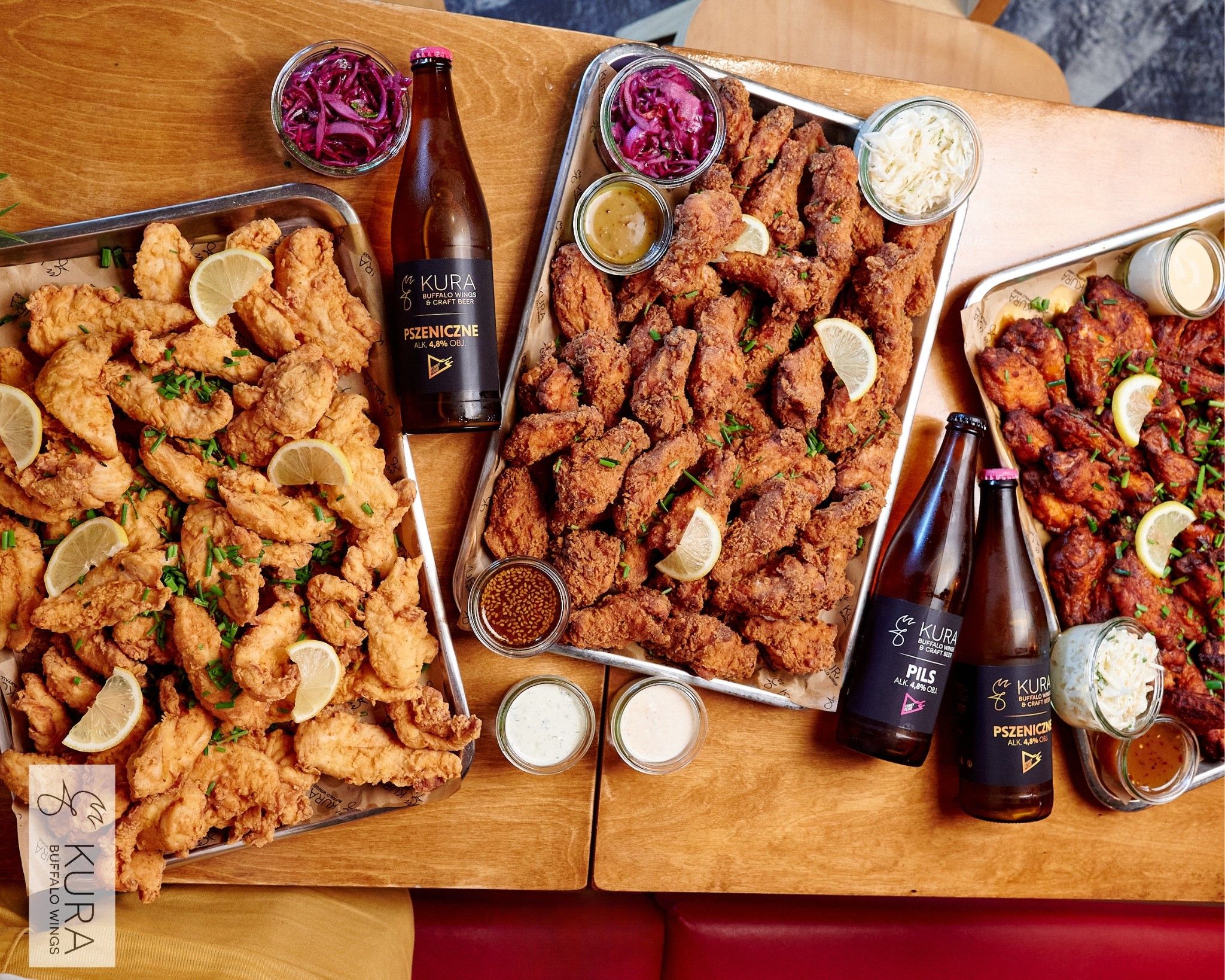 Podwójna porcja frytek, 2 sałatki colesław, 2 sosy i 2 dipy do wyboru. Przy wyborze glazurowanych skrzydeł, glazurujemy w pierwszym wybranym sosie.