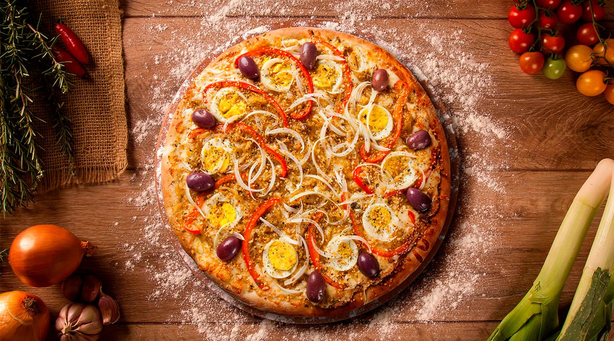(Molho de tomate, Mozzarella, Pimentos, Azeitonas,Cebola, Presunto ao natural e Azeite)