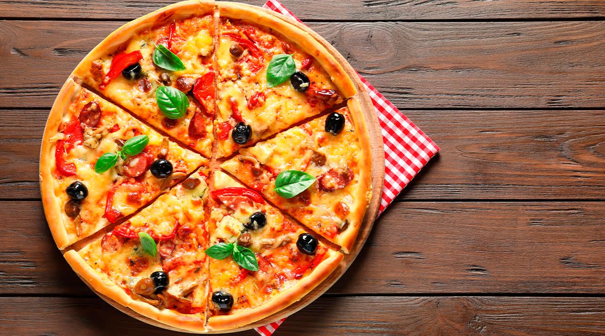 Molho de tomate, mozzarella, orégãos, pimento, cebola, tomates, azeitonas e queijo feta