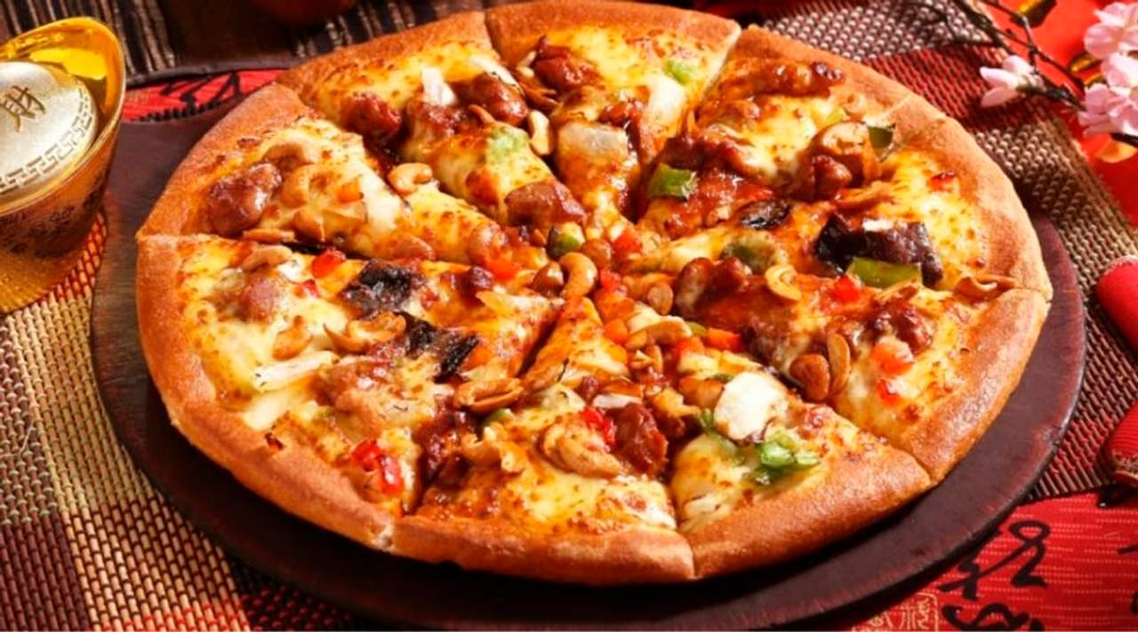 Massa dupla, queijo, fiambre, chouriço, cogumelos, bacon, carne, ovo estrelado, batata frita e molhos.