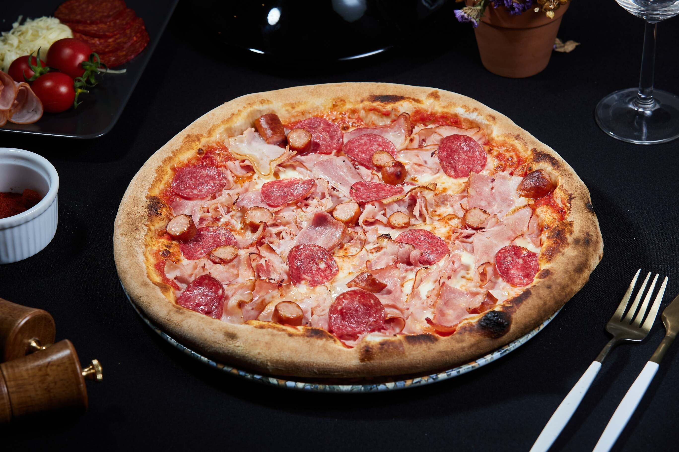 Aluat ,sos de rosii, mozzarella, prosciutto cotto, salam, bacon, carnati