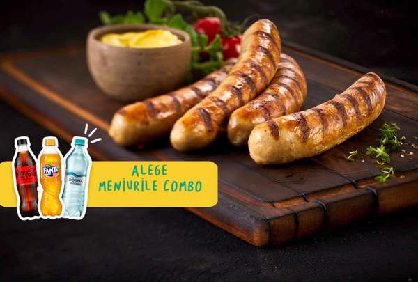 Mici 4 buc, cârnăciori 2 buc, cașcaval pane 2 buc, cartofi (2porții), sosuri 4 buc, 2 sucuri