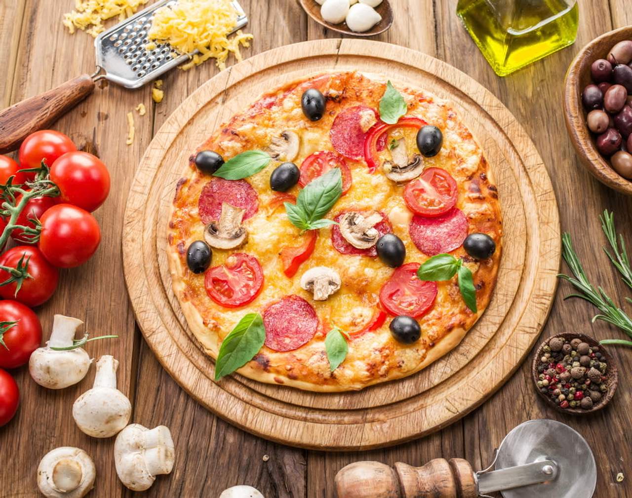 Blat pizza, sos de roșii, mozzarella, sunca, ciuperci, oregano, ulei de măsline, piper, busuioc - 1.2kg