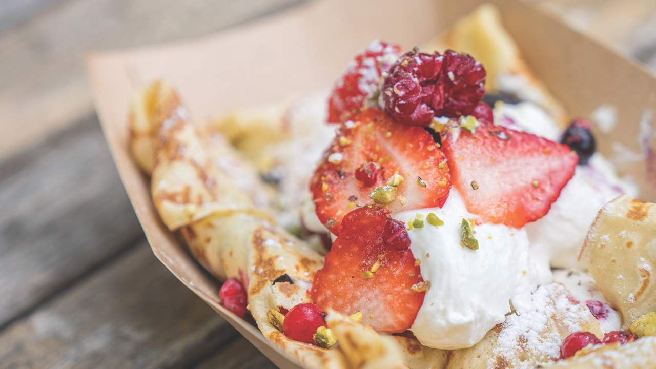 Lapte, făină, ouă, ulei, sare, esență de vanilie, portocală, zahăr vanilat, zahăr, esență rom, ciocolată albă, căpșuni - 330g